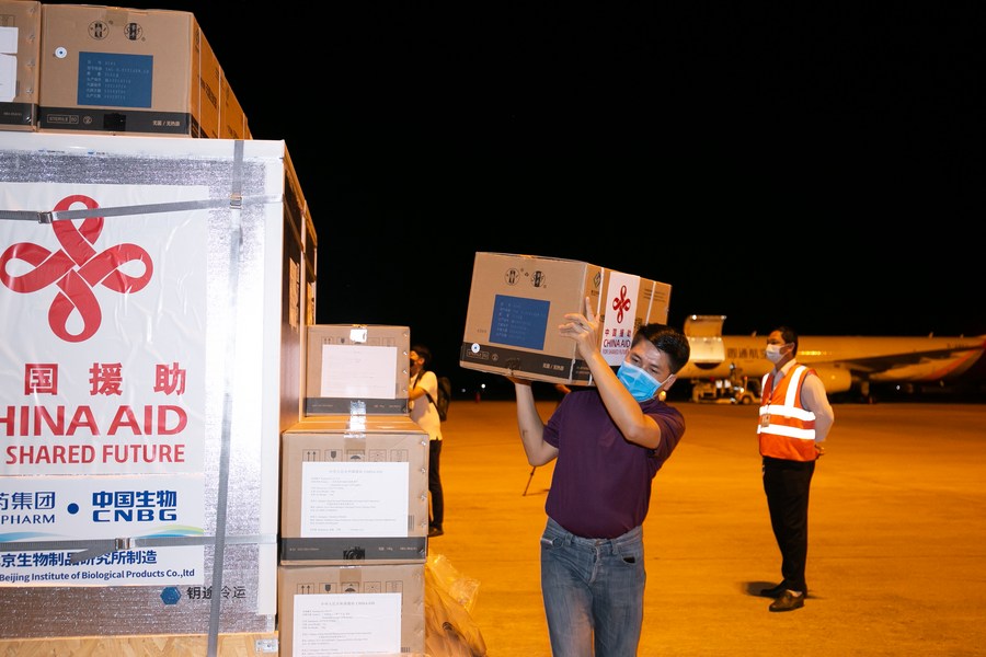 A batch of China-donated Sinopharm COVID-19 vaccines arrives at Wattay International Airport in Vientiane, Laos, Aug. 7, 2021. (Photo by Kaikeo Saiyasane/Xinhua)