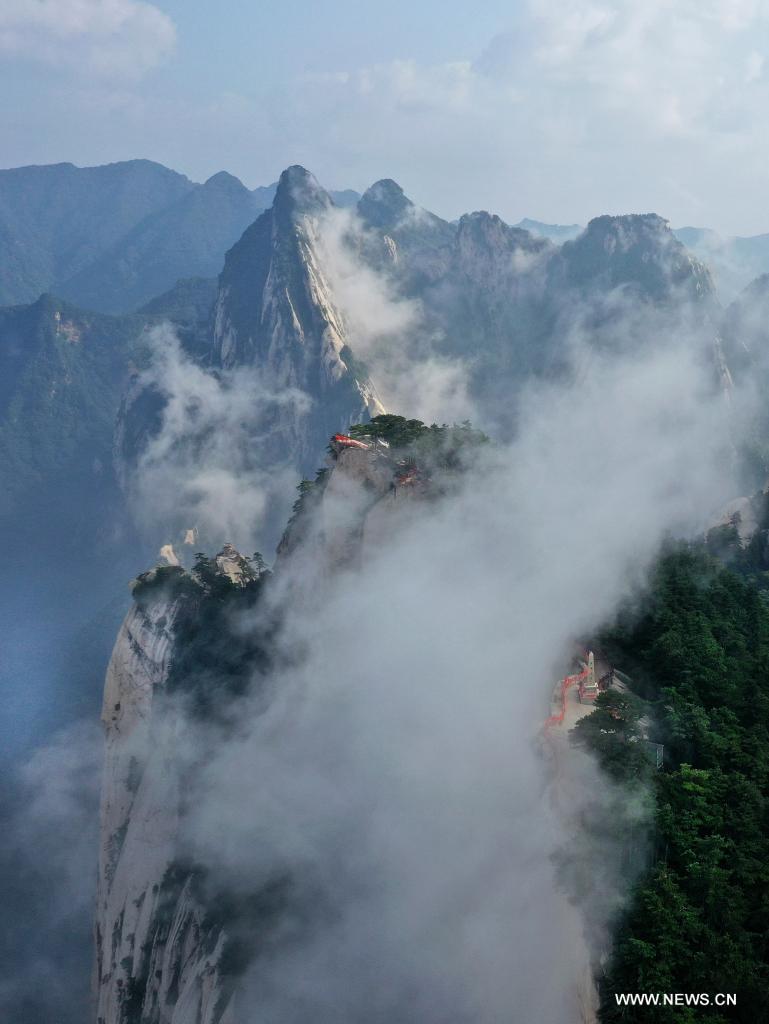Aerial photo taken on Aug. 14, 2021 shows the mist-shrouded Mount Huashan in Weinan City, northwest China's Shaanxi Province. (Xinhua/Tao Ming)