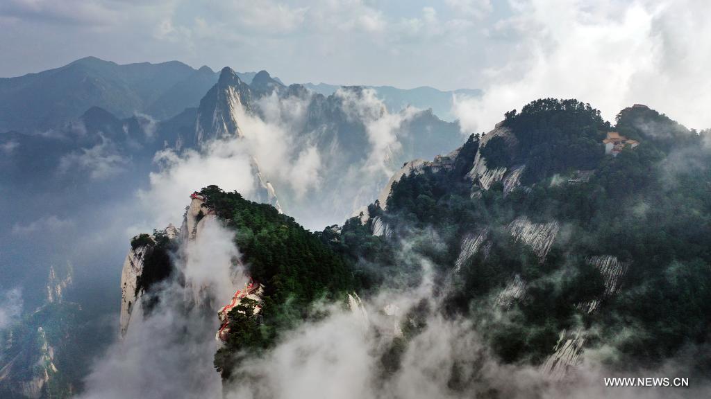 Aerial photo taken on Aug. 14, 2021 shows the mist-shrouded Mount Huashan in Weinan City, northwest China's Shaanxi Province. (Xinhua/Tao Ming)