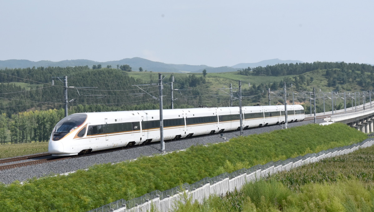 The Fuxing train on its test run on the Mudanjiang-Jiamusi High-speed Railway in Heilongjiang province on Sunday. (Photo/CHINA DAILY)