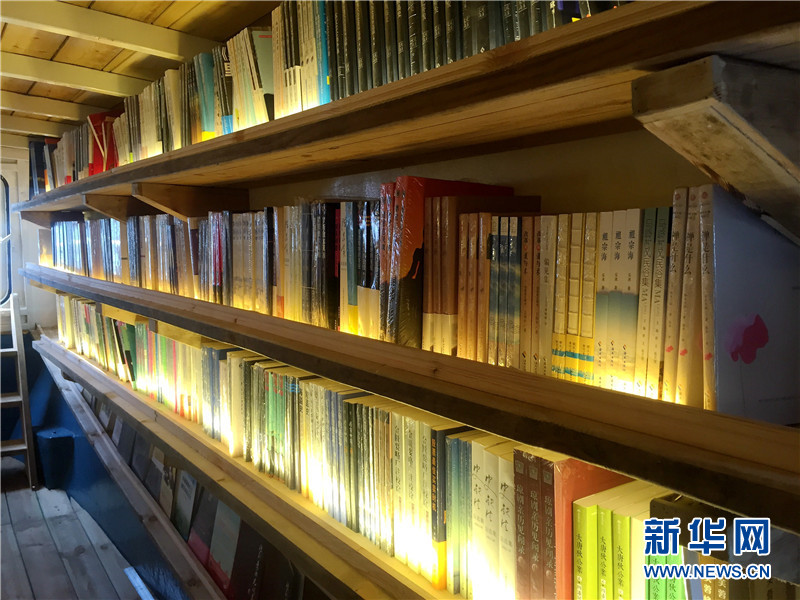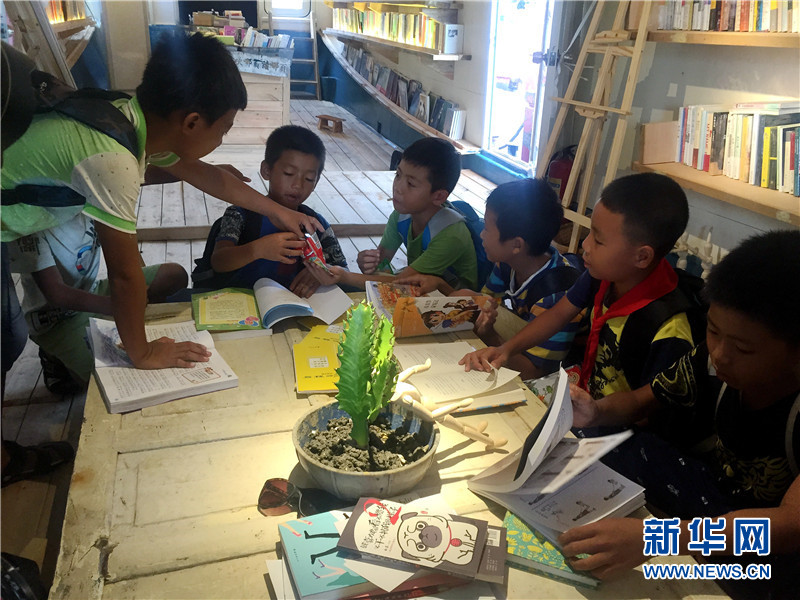 When three boats linked by ropes dock at a port in Sanya, a tourist city in southern China’s island province of Hainan, what jumps into sight is a library full of books. As the first public library on Xidao Island in Sanya, the library provides a place for locals to read, hold activities and for kids to study. The decorations inside the library, including the postcard wall, the decorative pictures, and the desks and chairs, were built using fishing nets, wooden parts and nails belonging to the boats.