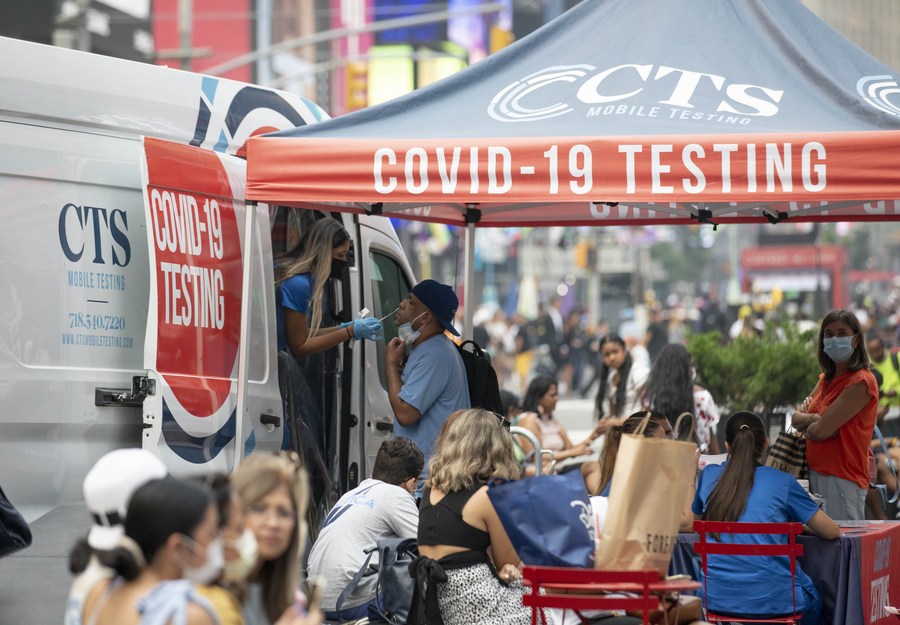 A man receives a COVID-19 test at a mobile testing site in Times Square, New York, the United States, July 20, 2021. (Xinhua/Wang Ying)
