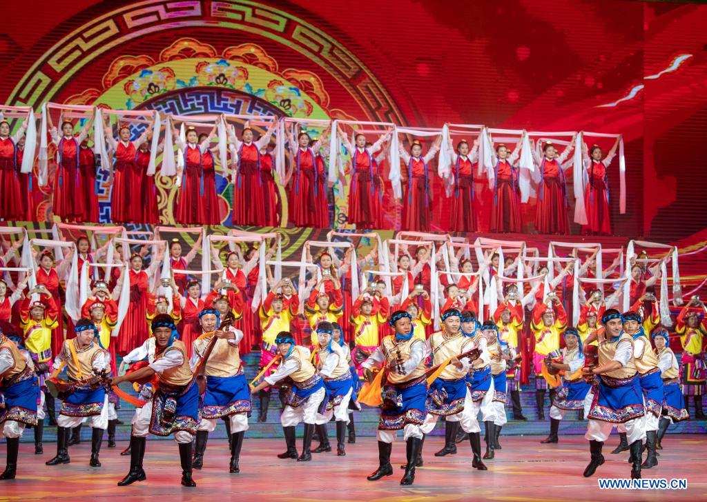 A grand gala is held in celebration of the 70th anniversary of the peaceful liberation of Tibet, in Lhasa, capital of southwest China's Tibet Autonomous Region, Aug. 19, 2021. (Xinhua/Zhai Jianlan)