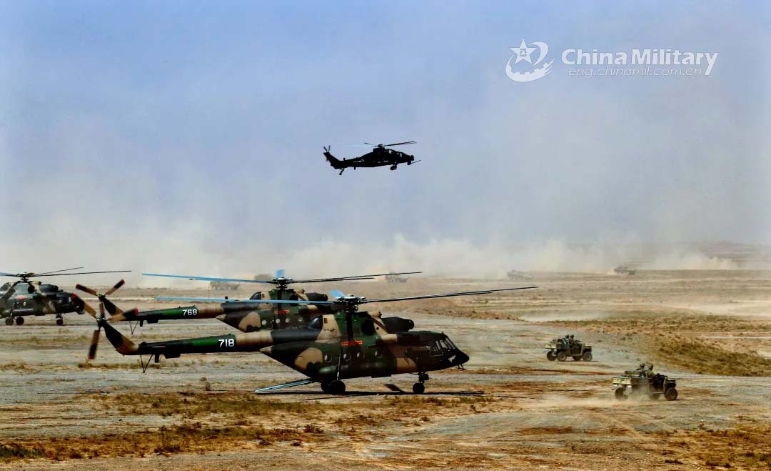 The assault vehicles "Lynx" rush out from the landed military helicopters to conduct coordinated operations in the China-Russia joint military exercise ZAPAD/INTERACTION-2021 at a training base of the PLA Army in Qingtongxia City of West China's Ningxia Hui Autonomous Region from August 9 to 13, 2021. (eng.chinamil.com.cn/Photo by Wang Weidong)