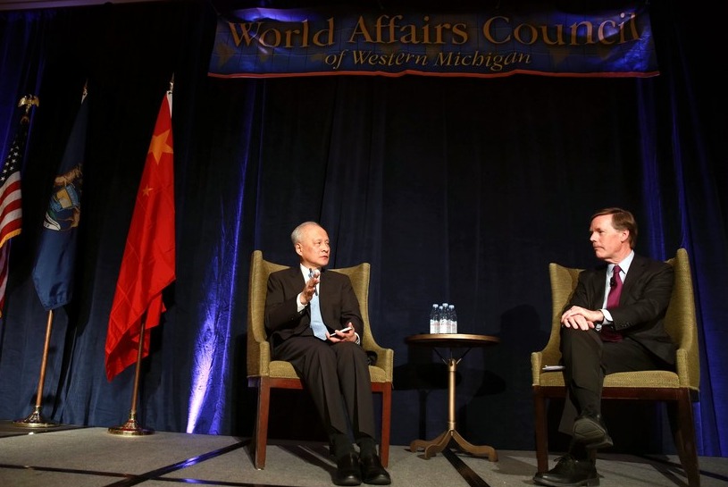 Chinese Ambassador to the United States Cui Tiankai (L) has a conversation with former U.S. Under Secretary of State Nicholas Burns at Grand Rapids, the United States, Feb. 8, 2019. (Xinhua/Wang Ping)
