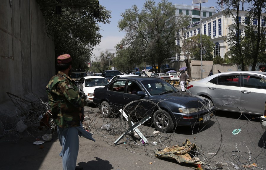 Afghan Taliban members are seen at a security checkpoint in Kabul, Afghanistan, Aug. 20, 2021. (Photo by Saifurahman Safi/Xinhua)