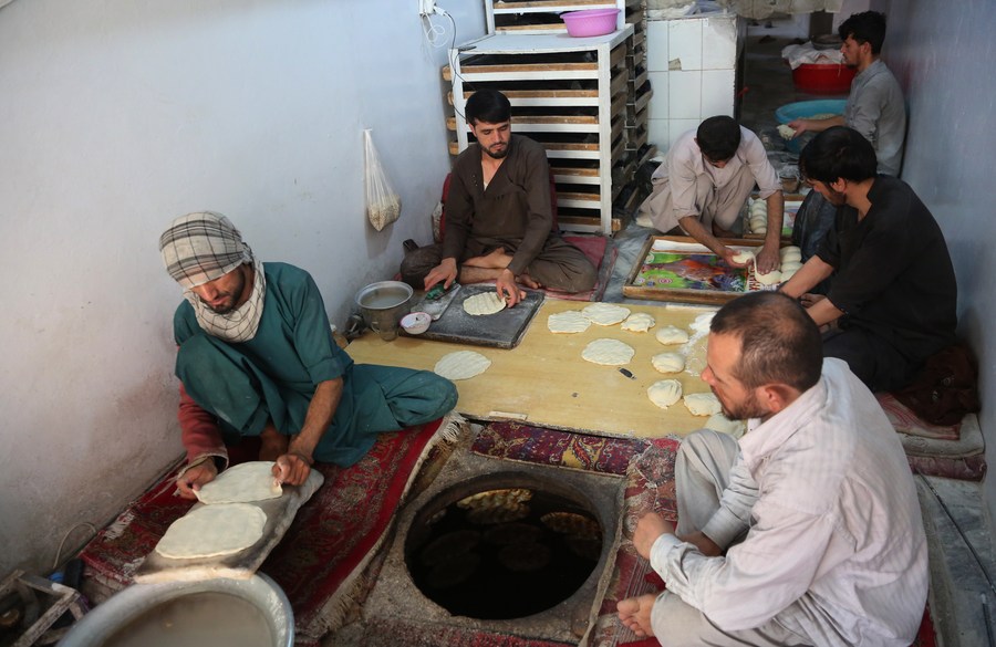 People work at a bakery in Kabul, capital of Afghanistan, Aug. 21, 2021. (Str/Xinhua)