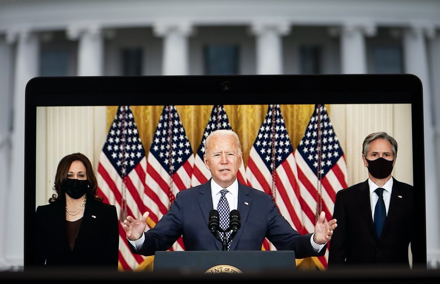 Photo taken in Arlington, Virginia, the United States, on Aug. 20, 2021 shows a screen displaying U.S. President Joe Biden (C) delivering remarks on Afghanistan at the White House in Washington, D.C. (Xinhua/Liu Jie)