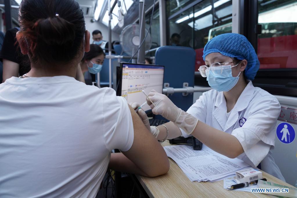 A woman gets inoculated against the COVID-19 in a mobile vaccination vehicle in Beibei District of southwest China's Chongqing, Aug. 20, 2021. Mobile vaccination vehicles were in service between 6 p.m. and 10 p.m. in some parts of Beibei District to facilitate COVID-19 vaccination. (Photo by Qin Tingfu/Xinhua)