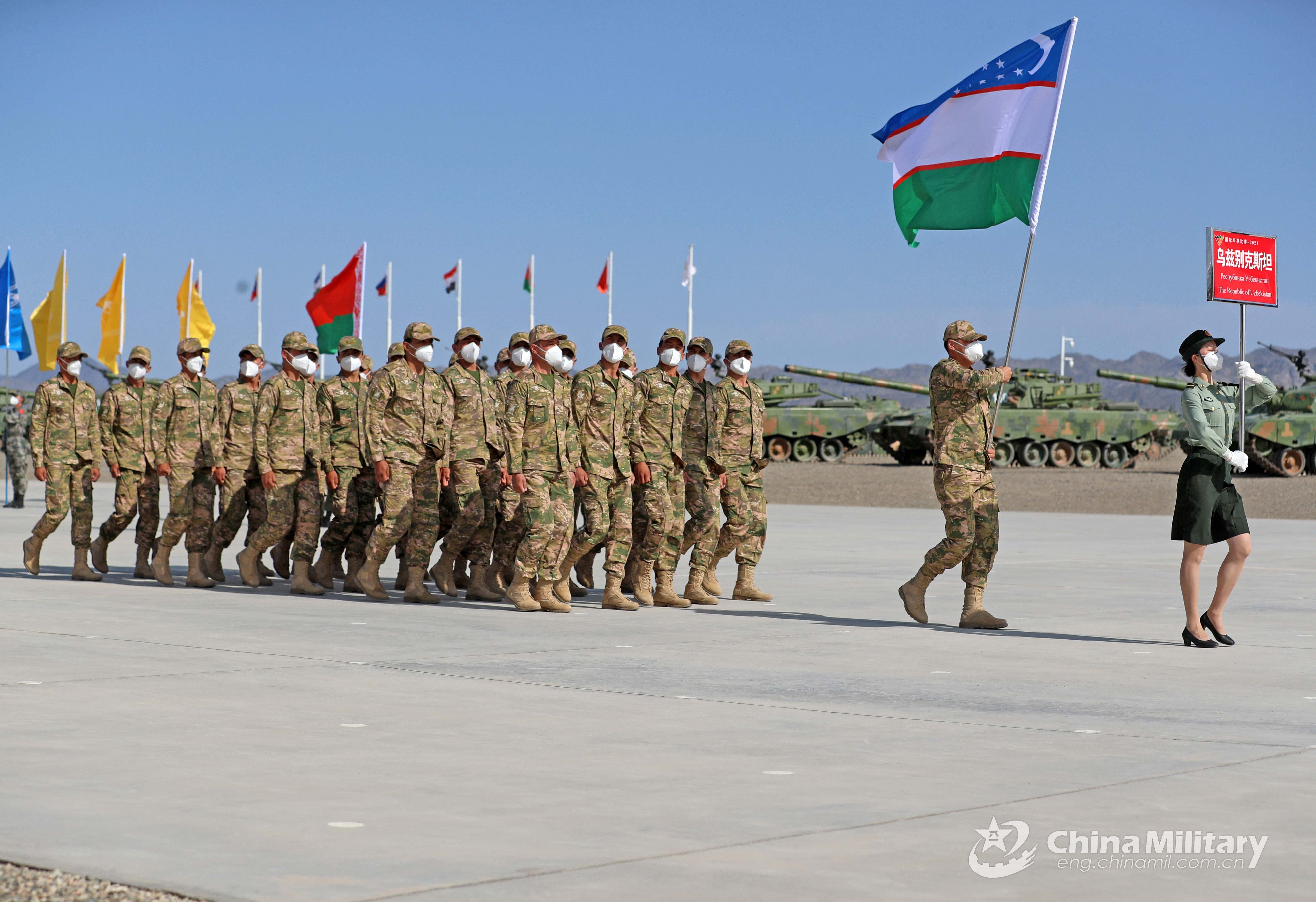 The opening ceremony of three competitions of the International Army Games (IAG) 2021 is held at the "Suvorov Attack" competition venue in Korla, northwest China's Xinjiang Uygur Autonomous Region, on August 22, 2021. The picture shows the Uzbek participating troops march past the reviewing stand at the ceremony. (Photo by Luo Xingcang)