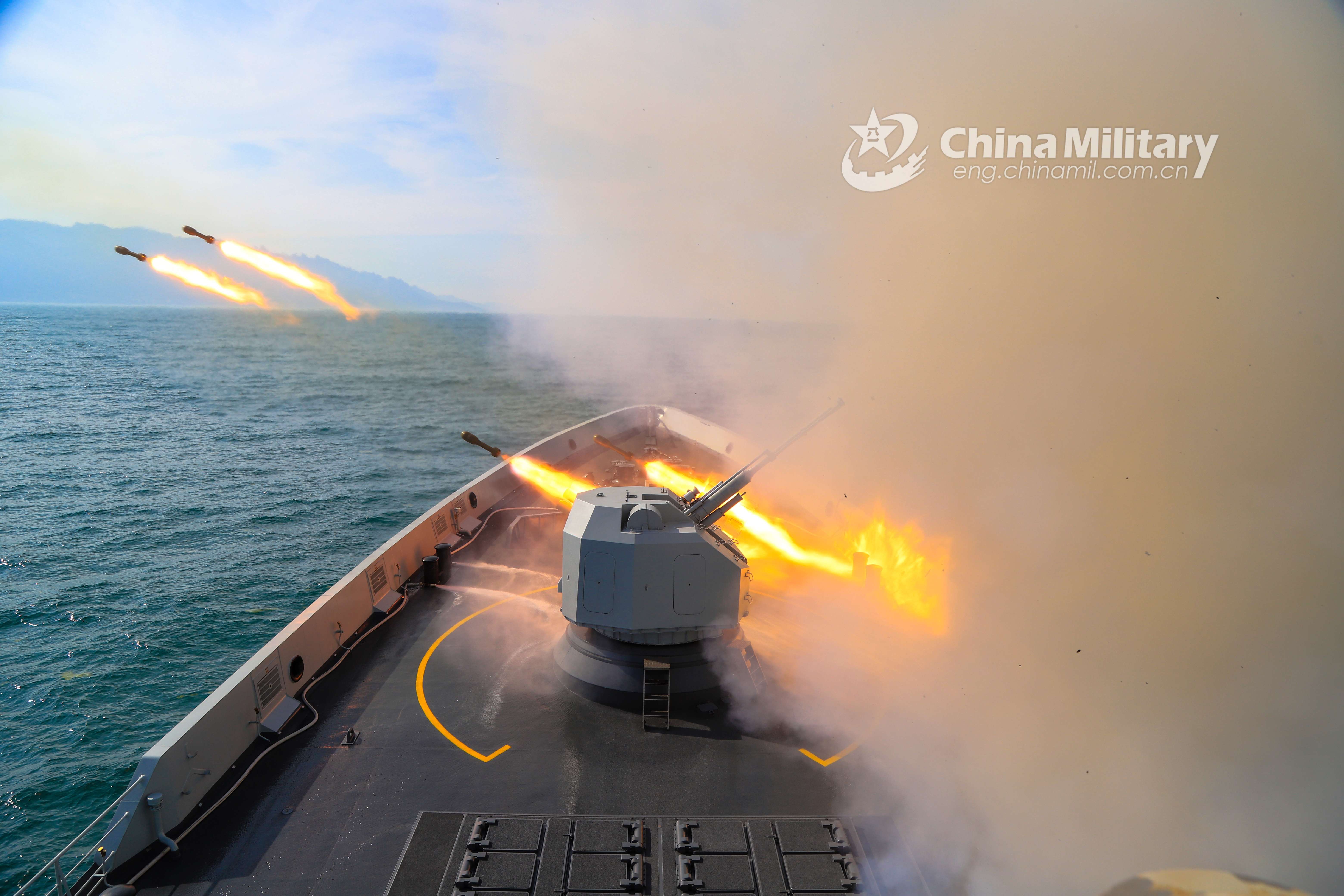 The guided-missile frigate Anqing attached to a destroyer flotilla with the navy under the PLA Northern Theater Command fires rocket-propelled depth charges during a maritime training exercise in late July, 2021. (eng.chinamil.com.cn/Photo by Ma Yubin)