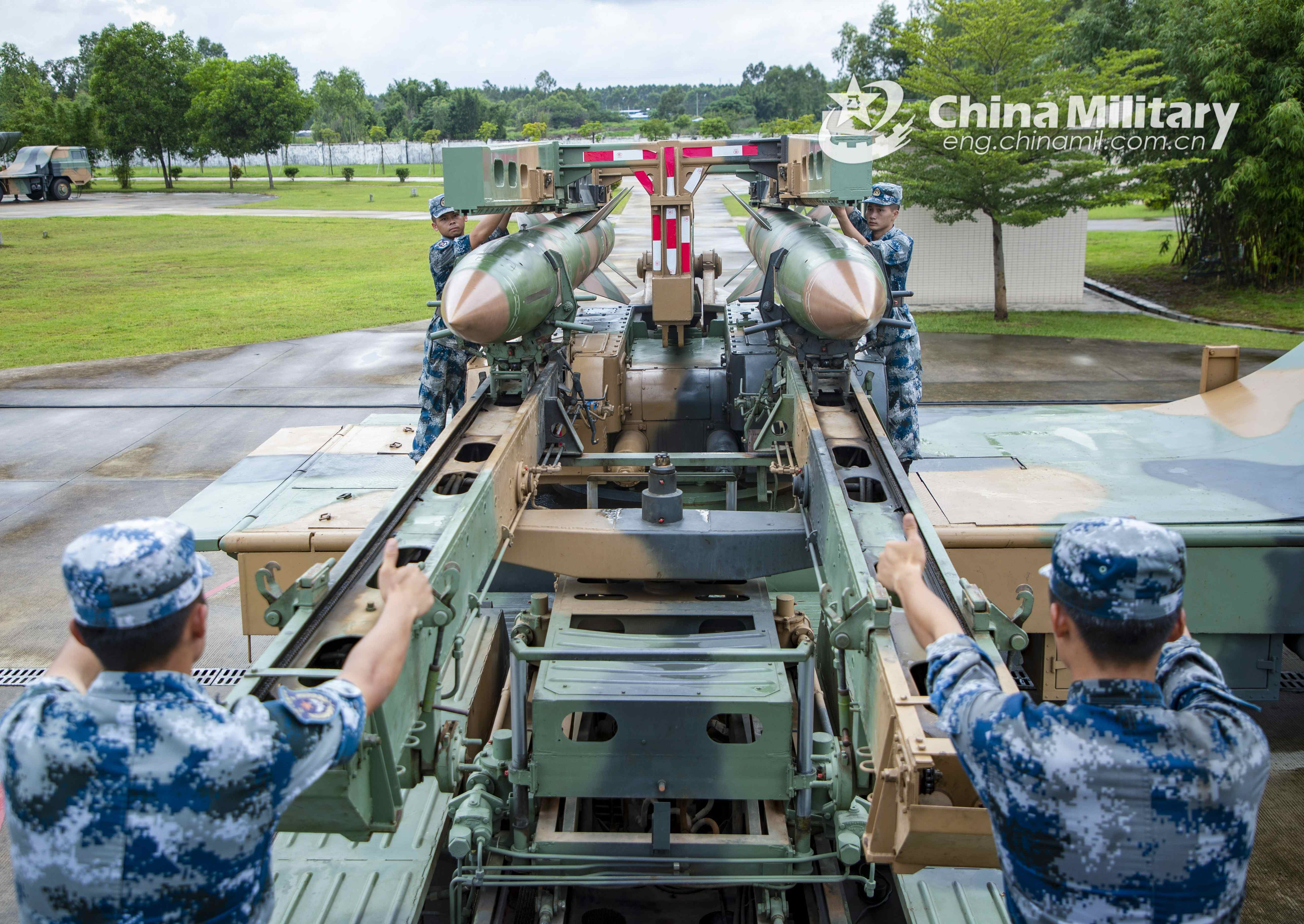 Airmen assigned to an air-defense brigade with the air force under the PLA Southern Theater Command practice loading missiles onto a missile launching vehicle during a field training on August 11, 2021. (eng.chinamil.com.cn/Photo by Pei Jun)