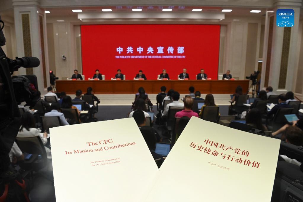 The Publicity Department of the Communist Party of China (CPC) Central Committee releases a document titled "The CPC: Its Mission and Contributions" at a press conference in Beijing, capital of China, Aug. 26, 2021. (Xinhua/Jin Liangkuai)