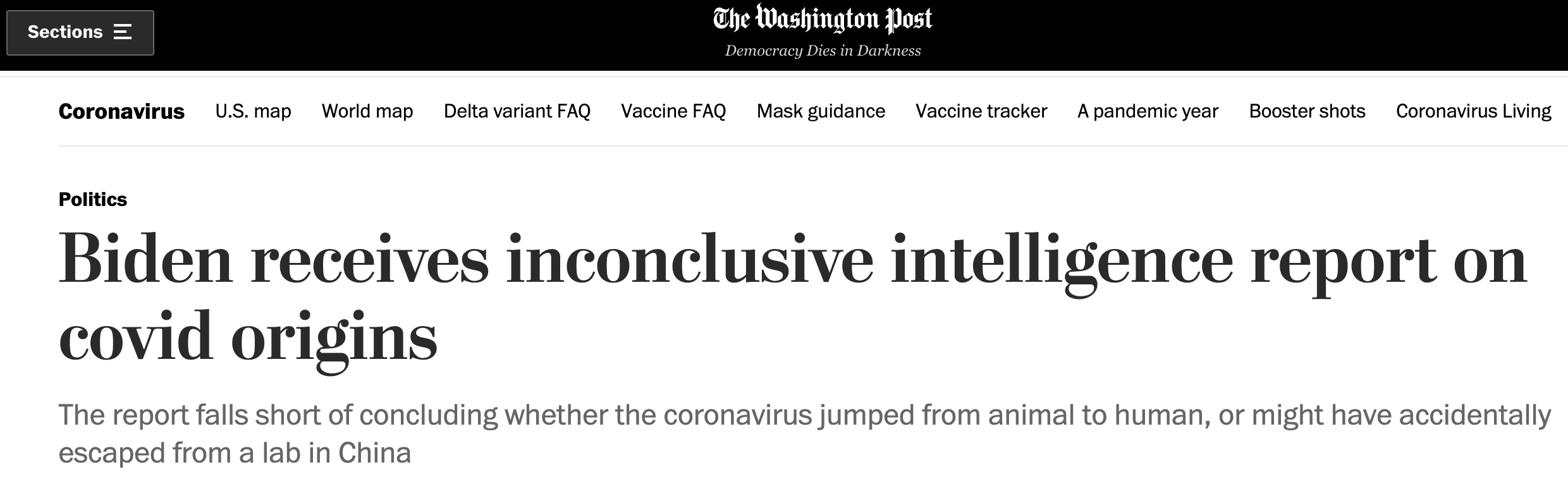 A screenshot of the Washington Post article reporting that the intelligence community's 90-day investigation on COVID-19 origins has been inconclusive.