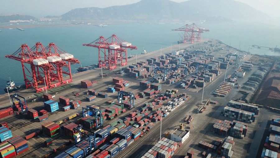 Aerial photo taken on Jan. 14, 2021 shows the container terminal of the Lianyungang Port in Lianyungang City, east China's Jiangsu Province. (Photo by Geng Yuhe/Xinhua)
