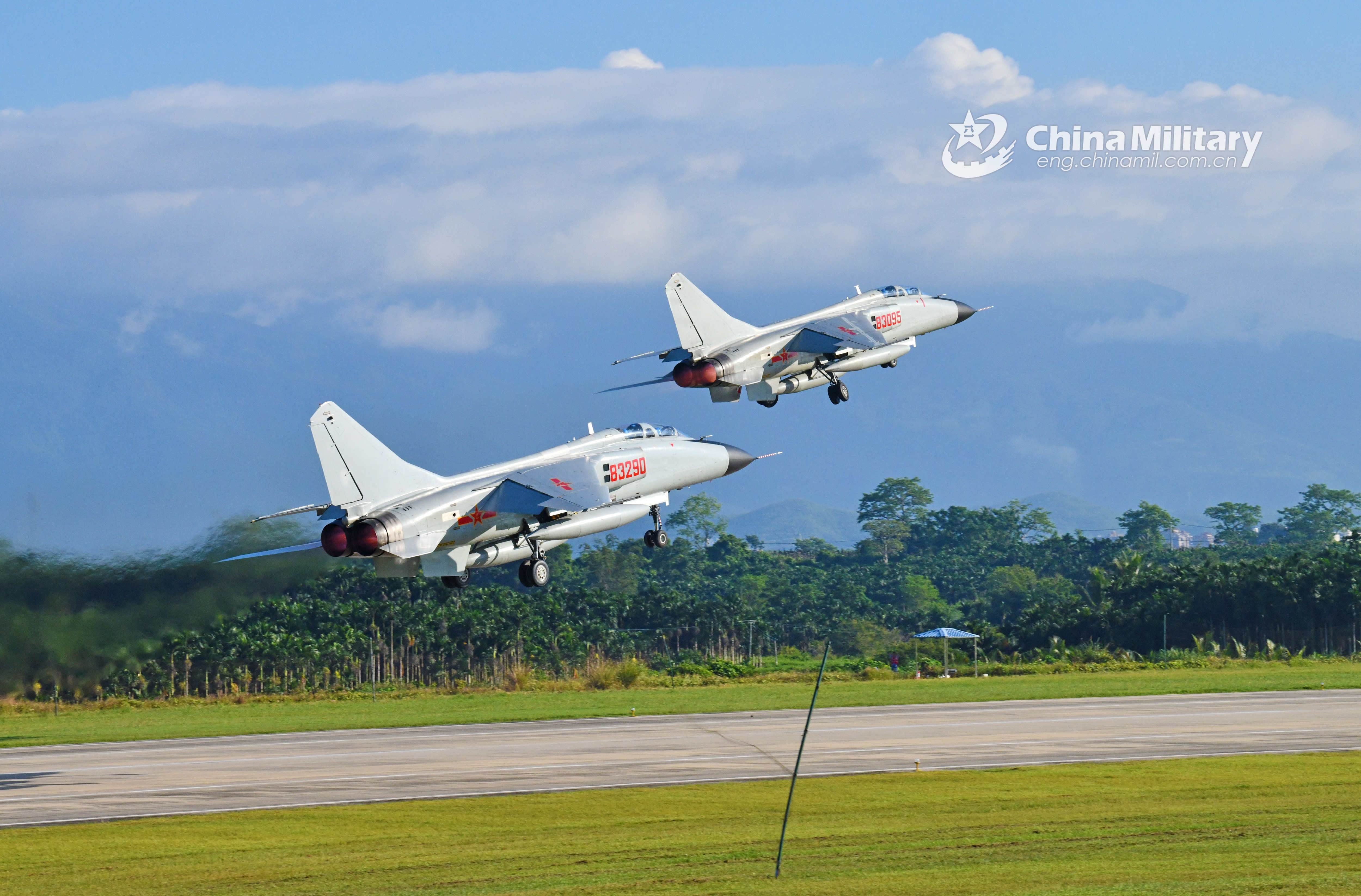 Fighter jets attached to a naval aviation brigade under the PLA Southern Theater Command take off in formation for a round-the-clock flight training exercise on August17, 2021. (eng.chinamil.com.cn/Photo by Zhuo Lingpeng)