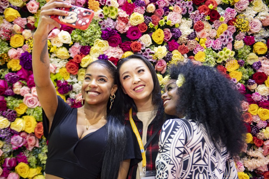 A visitor (C) poses for a group photo with Cuban dancers at the Cuba pavilion during the second China International Import Expo (CIIE) in Shanghai, east China, Nov. 7, 2019. (Xinhua/Purbu Zhaxi)