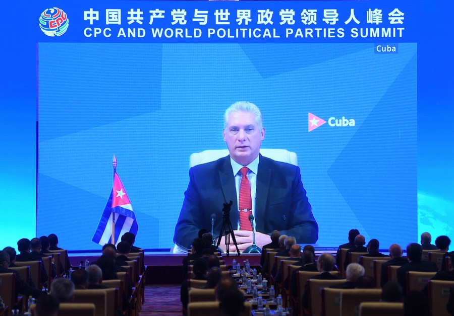 Miguel Diaz-Canel, first secretary of the Communist Party of Cuba Central Committee and Cuban president, addresses the Communist Party of China (CPC) and World Political Parties Summit on July 6, 2021. (Xinhua/Jin Liangkuai)