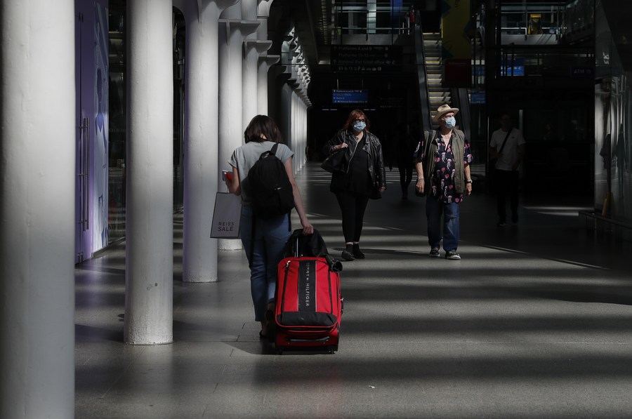 Passengers walk at St. Pancras International Station in London, Britain, July 29, 2021. (Xinhua/Han Yan)