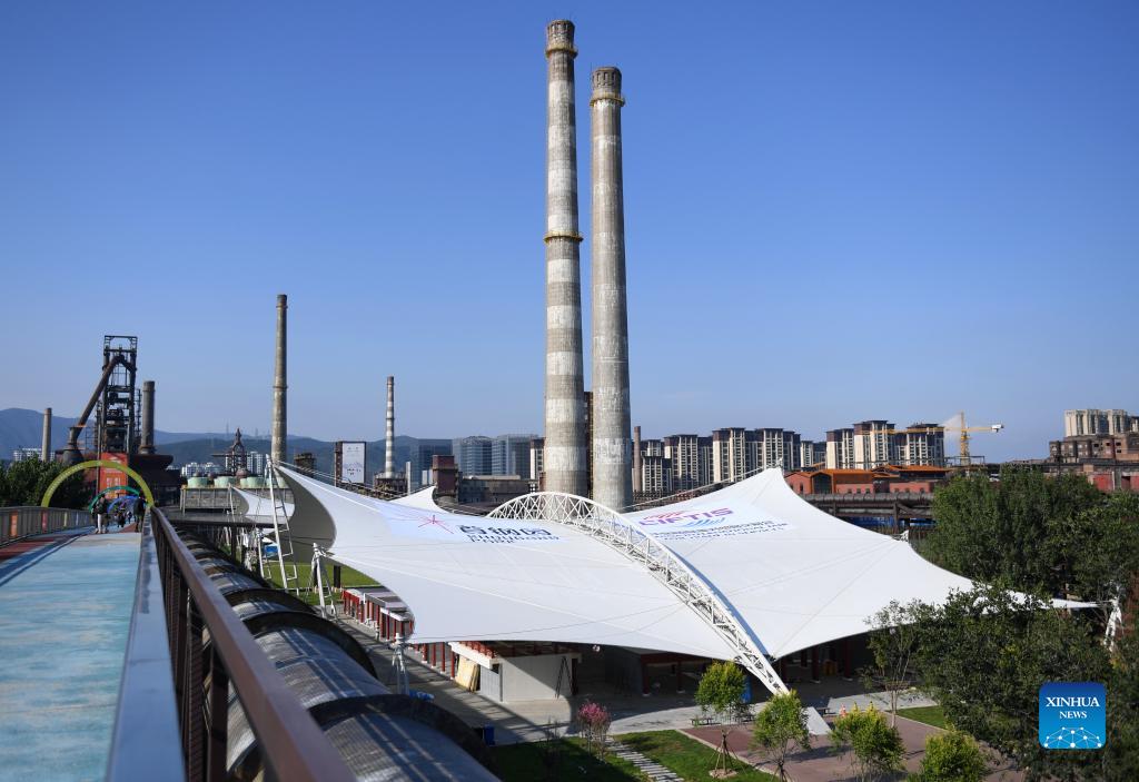 Photo taken on Aug. 31, 2021 shows the venue of the China International Fair for Trade in Services (CIFTIS) at Shougang Park, a steel mill-turned cultural and sports complex, in Beijing, capital of China. The CIFTIS, a major platform for trade in services in China, will take place from Sept. 2 to 7. With its traditional venue of the China National Convention Center hosting most of the CIFTIS events, eight thematic exhibitions and several forums and meetings of CIFTIS will take place for the first time in Shougang Park, its organizers said on Tuesday. (Xinhua/Zhang Chenlin)