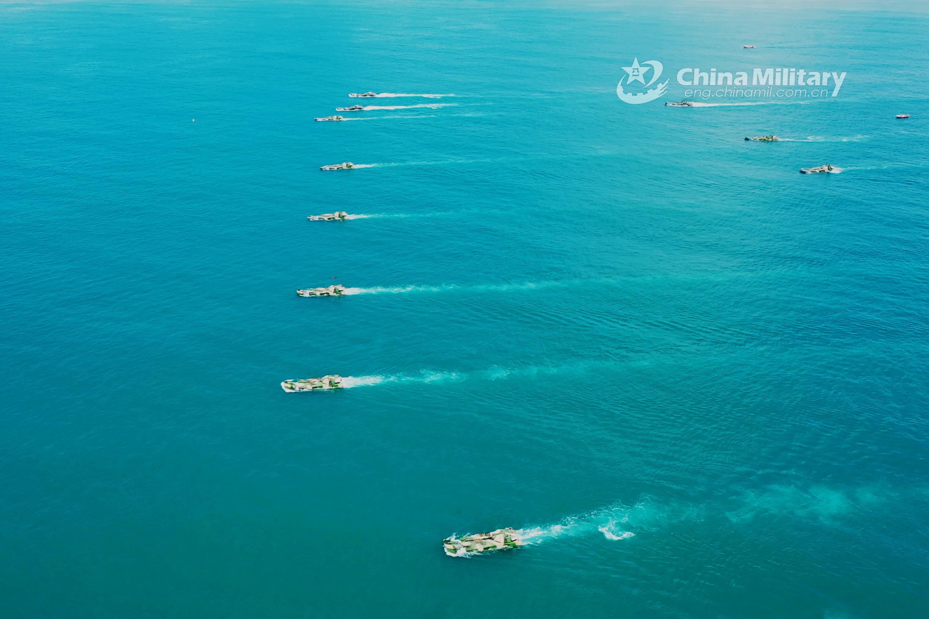 A group of amphibious armored vehicles attached to a brigade of the army under the PLA Eastern Theater Command maneuver towards the designated target area in formation to make their ways to the beach-head during a recent amphibious assault training exercise. The Army brigade has organized amphibious landing drills on subjects of landing craft ferrying, assault wave formation, beach-landing, obstacle breaking and so on. (eng.chinamil.com.cn/Photo by Zeng Bingyang)