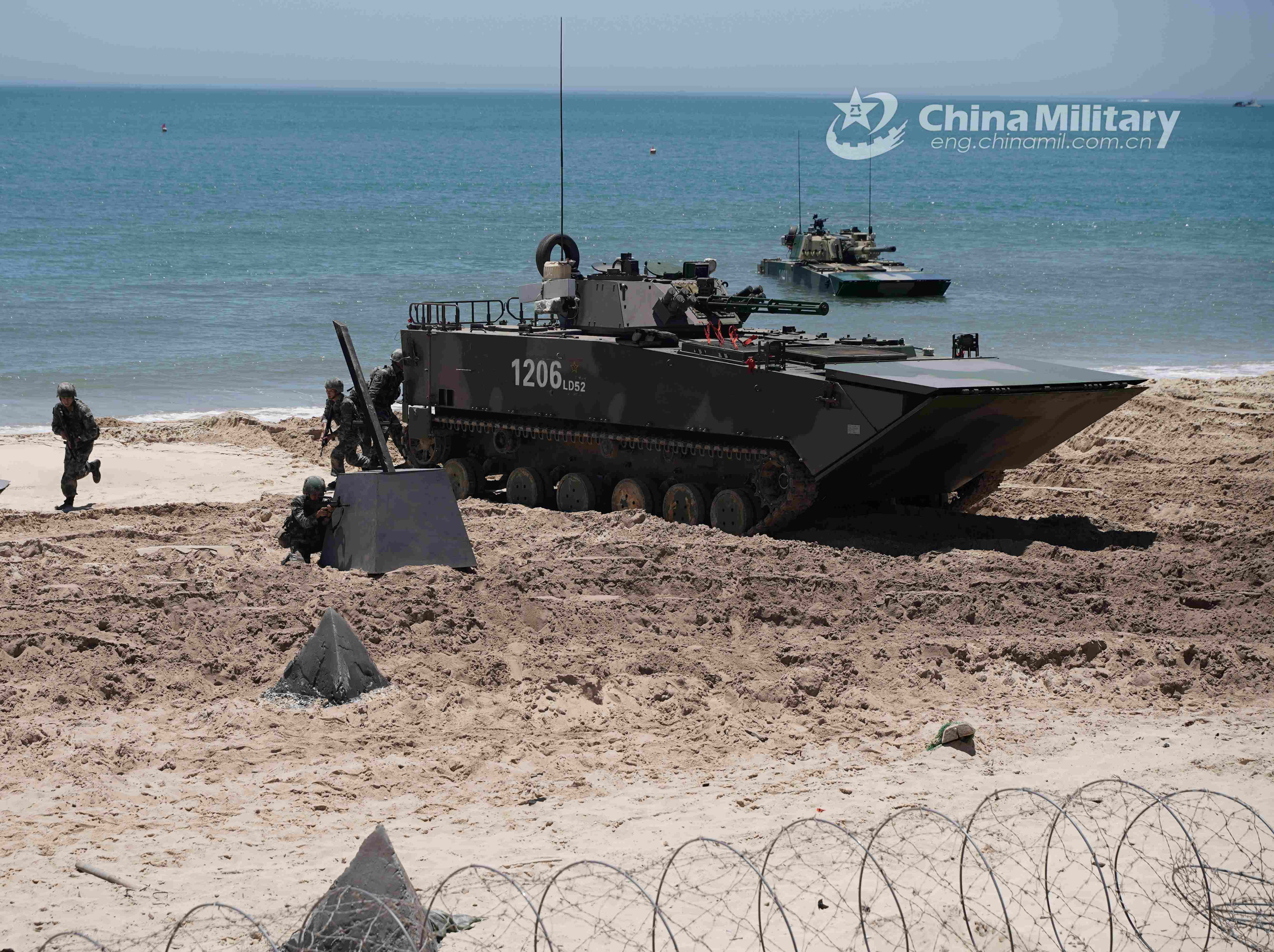 Soldiers assigned to a brigade of the army under the PLA Eastern Theater Command move forward for assault after disembarking from their amphibious infantry fighting vehicle (IFV) during a recent beach raid training exercise. The Army brigade has organized amphibious landing drills on subjects of landing craft ferrying, assault wave formation, beach-landing, obstacle breaking and so on. (eng.chinamil.com.cn/Photo by Zeng Bingyang)