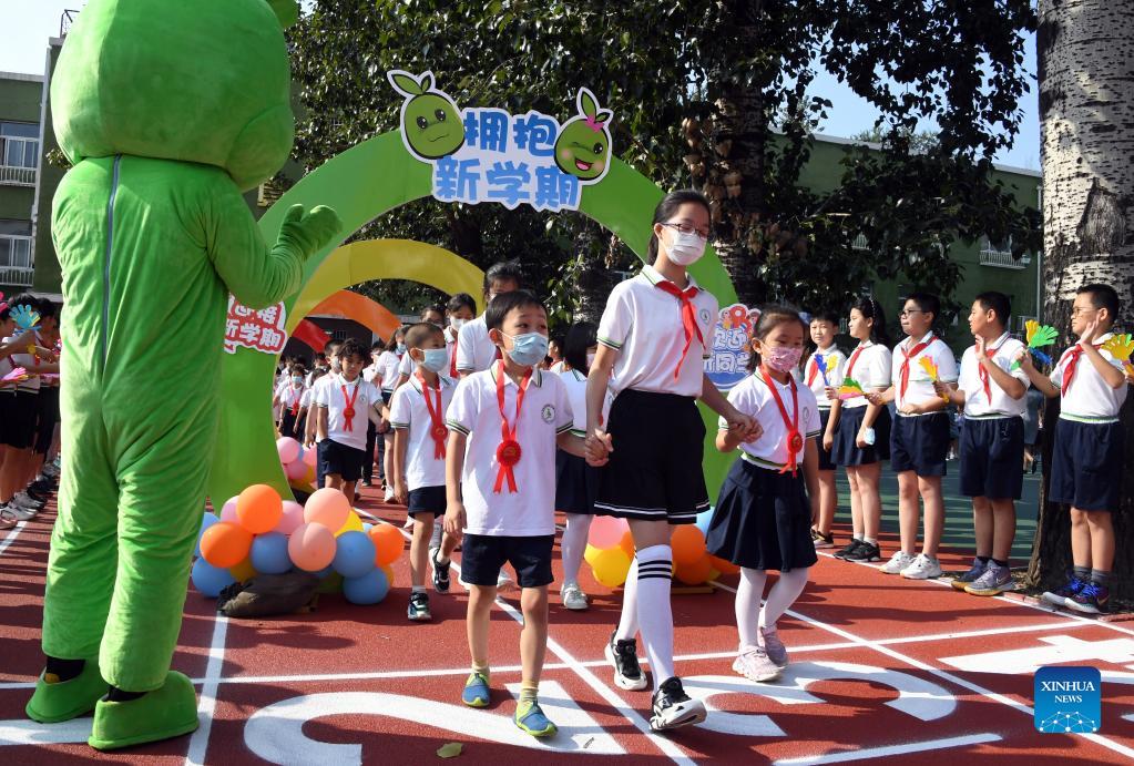 Pupils walk to attend the opening ceremony for the new semester at the Taipinglu elementary school in Beijing, capital of China, Sept. 1, 2021. Elementary and middle schools in China kicked off a new school year on Wednesday. (Xinhua/Ren Chao)
