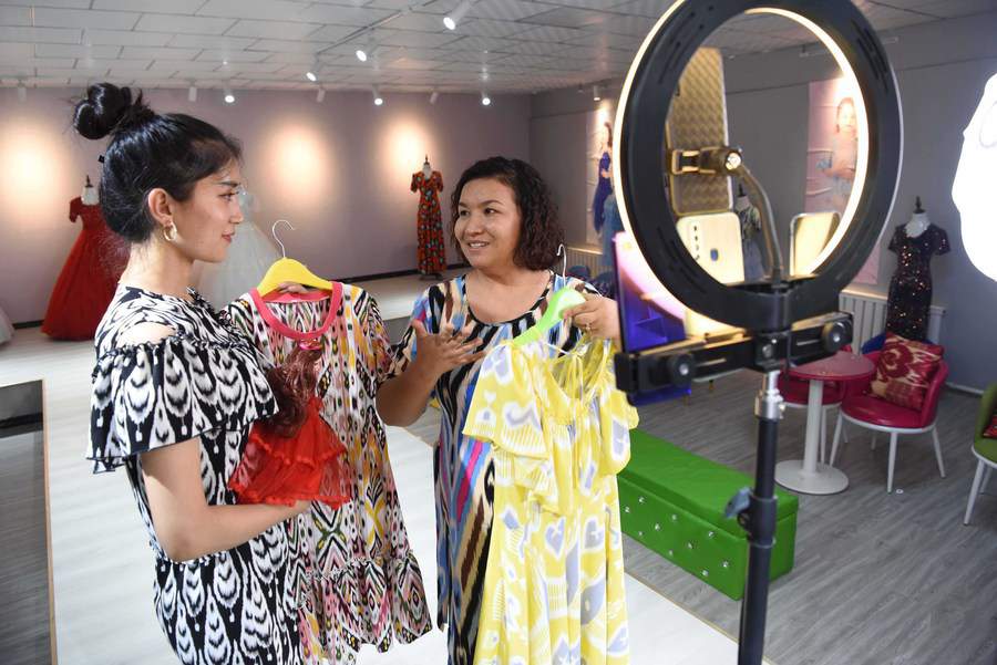A director (R) of a garment company, who gets capital support from south China's Guangdong Province, talks with her employee on the details of livestreaming to promote sales in Payzawat County, northwest China's Xinjiang Uygur Autonomous Region, July 11, 2021. (Xinhua/Ding Lei)