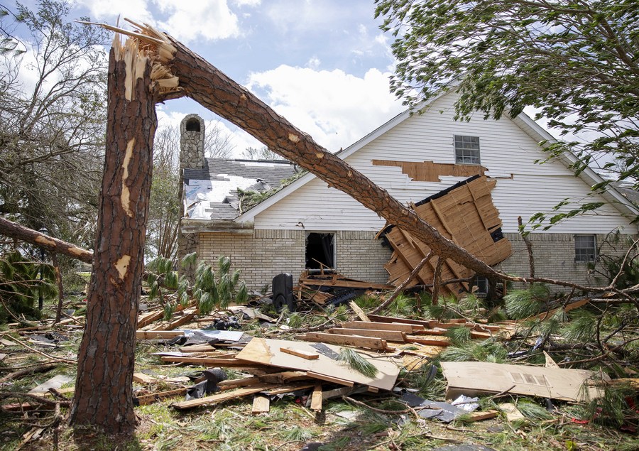 A tree is seen snapped off by Hurricane Ida in Houma, Louisiana, the United States, Aug. 30, 2021. (Photo by Nick Wagner/Xinhua)