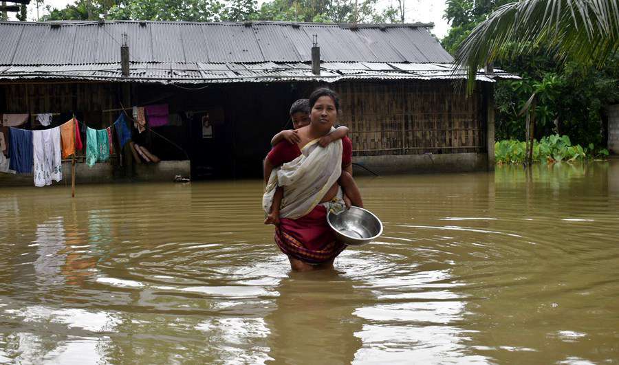 A woman carrying a child wades in flood water caused by heavy rain and overflowing of river at Dhemaji district of India's northeastern state of Assam, on Aug. 28, 2021. (Str/Xinhua)