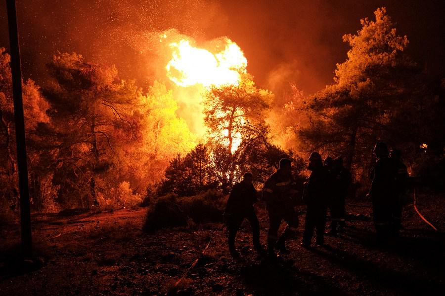 Fire fighters battle a blaze raging near Makrymalli village on Evia island, Greece, on Aug. 13, 2019. (Photo by Nick Paleologos/Xinhua)