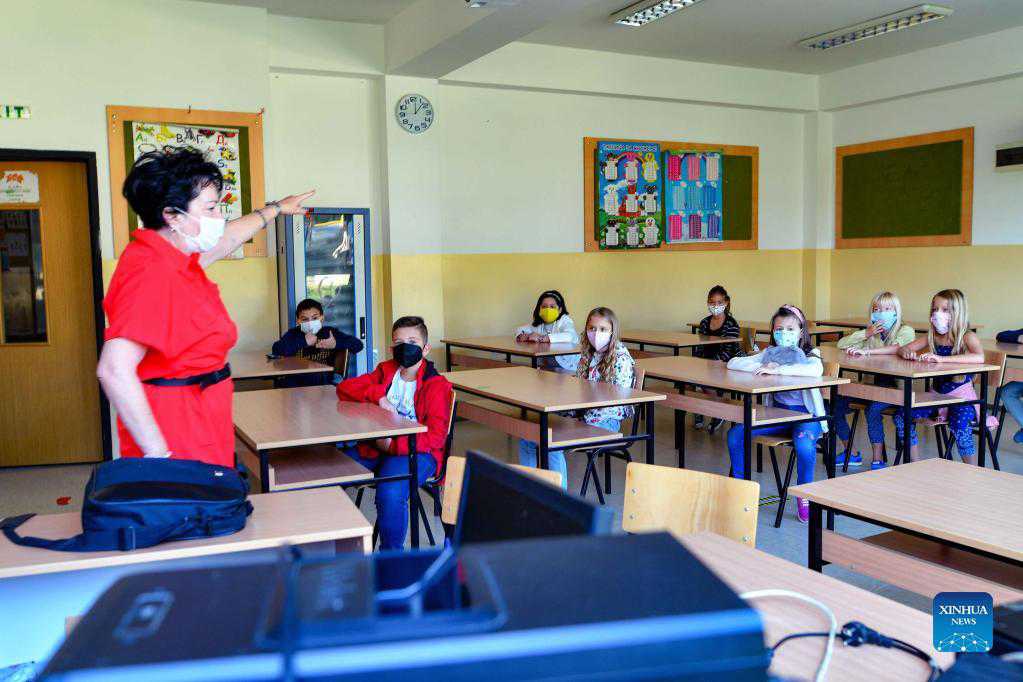 Pupils are seen on their first day of school in Skopje, North Macedonia, on Sept. 1, 2021. (Photo by Tomislav Georgiev/Xinhua)