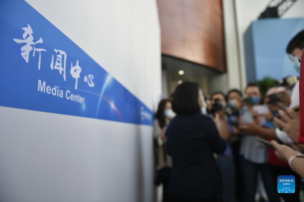 Journalists work at the media center of the China International Fair for Trade in Services (CIFTIS) at the China National Convention Center in Beijing, capital of China, Sept. 1, 2021. The media center of the CIFTIS started trial operation on Wednesday. The CIFTIS is to be held from Sept. 2 to 7 this year. (Xinhua/Lu Peng)