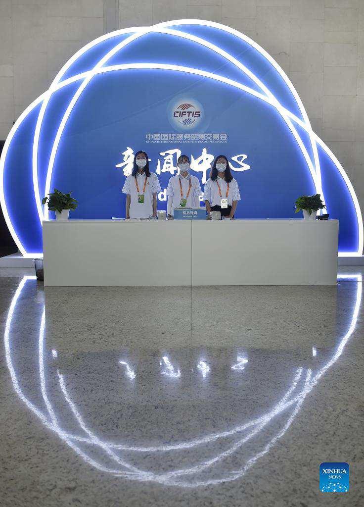 Photo taken on Sept. 1, 2021 shows an information desk at the media center of the China International Fair for Trade in Services (CIFTIS) at the China National Convention Center in Beijing, capital of China, Sept. 1, 2021. The media center of the CIFTIS started trial operation on Wednesday. The CIFTIS is to be held from Sept. 2 to 7 this year. (Xinhua/Lu Peng)