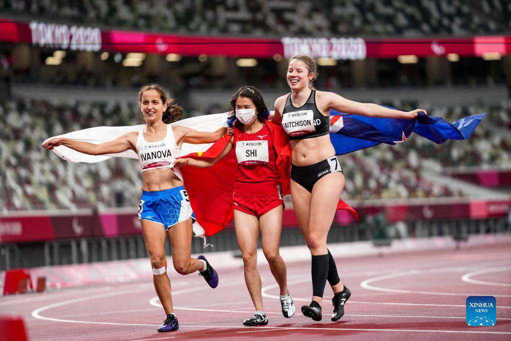 Elena Ivanova of RPC, Shi Yiting of China and Danielle Aitchison of New Zealand (L to R) celebrate after the women's T36 class 100m final of athletics event at the Tokyo 2020 Paralympic Games in Tokyo, Japan, Sept. 1, 2021. (Xinhua/Zhang Cheng)