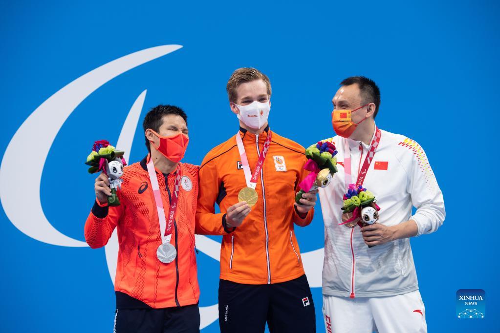 Keiichi Kimura of Japan, Rogier Dorsman of the Netherlands and Yang Zunbo of China (L to R) attend the medal ceremony of the men's 100m breaststroke SB11 final of swimming event at the Tokyo 2020 Paralympic Games in Tokyo, Japan, Sept. 1, 2021. (Xinhua/Cheong Kam Ka)
