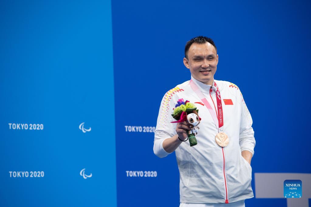 Yang Bozun of China attends the medal ceremony of the men's 100m breaststroke SB11 final of swimming event at the Tokyo 2020 Paralympic Games in Tokyo, Japan, Sept. 1, 2021. (Xinhua/Cheong Kam Ka)