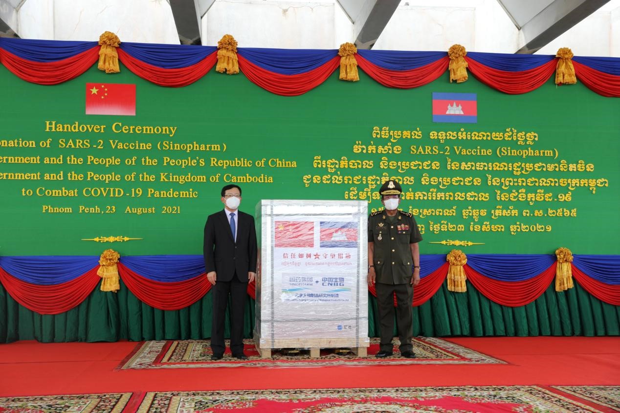 The Cambodian government holds a ceremony at the Phnom Penh International Airport in the country to welcome 500,000 doses of COVID-19 vaccines, which is the third batch of COVID-19 vaccines donated by the Chinese military, August 23, 2021. (Photo/Embassy of China in Cambodia)