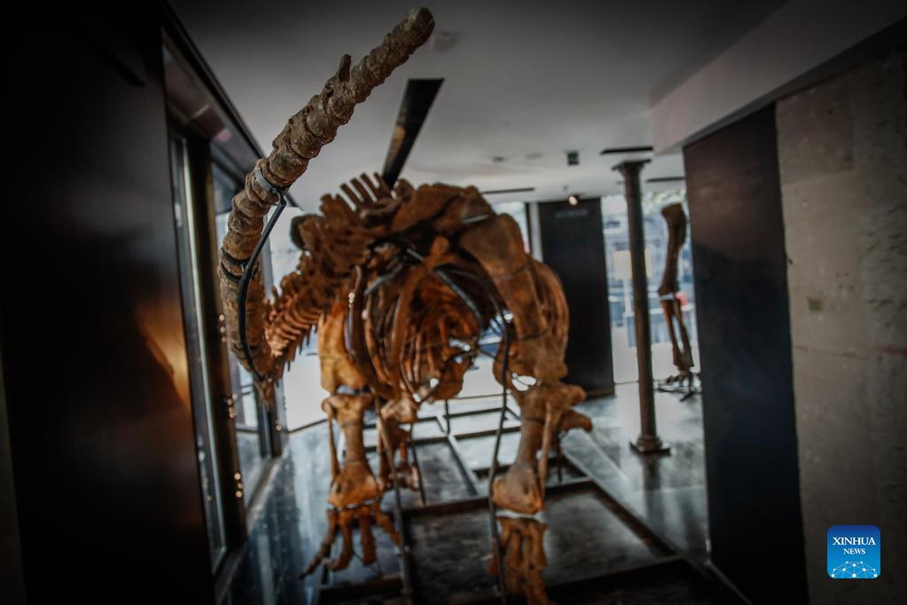 A skeleton of a triceratops is exposed ahead of its auction sale at Drouot auction house in Paris, France, Sept. 1, 2021. "Big John", the triceratops with an 8-meter long skeleton, is on display in Paris until Oct. 20, before be auctioned. (Photo by Aurelien Morissard/Xinhua)