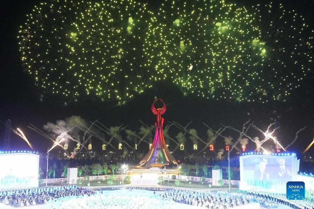 Fireworks are seen during a celebration of the country's 30th anniversary of independence, in Tashkent, Uzbekistan, on Sept. 1, 2021. Uzbekistan became independent in 1991, and Sept. 1 of each year is Independence Day. (Photo by Zafar Khalilov/Xinhua)