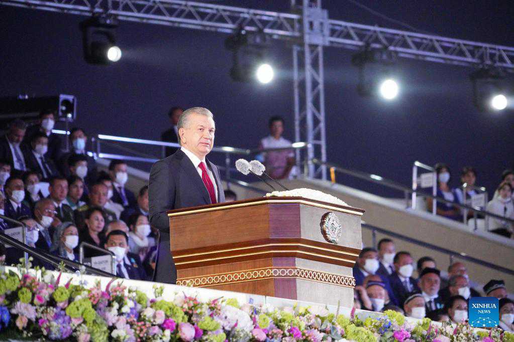 Uzbek President Shavkat Mirziyoyev speaks during a celebration of the country's 30th anniversary of independence, in Tashkent, Uzbekistan, on Sept. 1, 2021. Uzbekistan became independent in 1991, and Sept. 1 of each year is Independence Day. (Photo by Zafar Khalilov/Xinhua)