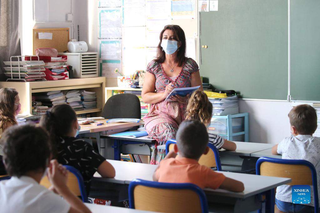 Students attend a class at Fontonne school on the first day of the new school year in Antibes, southern France, on Sept. 2, 2021. (Photo by Serge Haouzi/Xinhua)