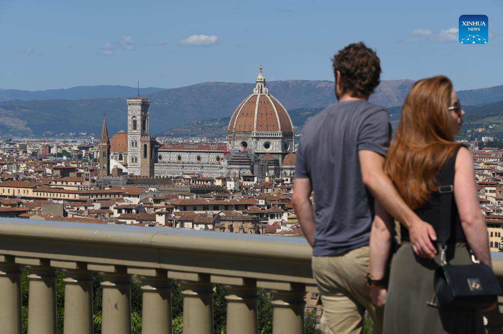 Tourists overlook the city of Florence at Piazzale Michelangelo in Florence, Italy, on Sept. 2, 2021. (Photo by Alberto Lingria/Xinhua)