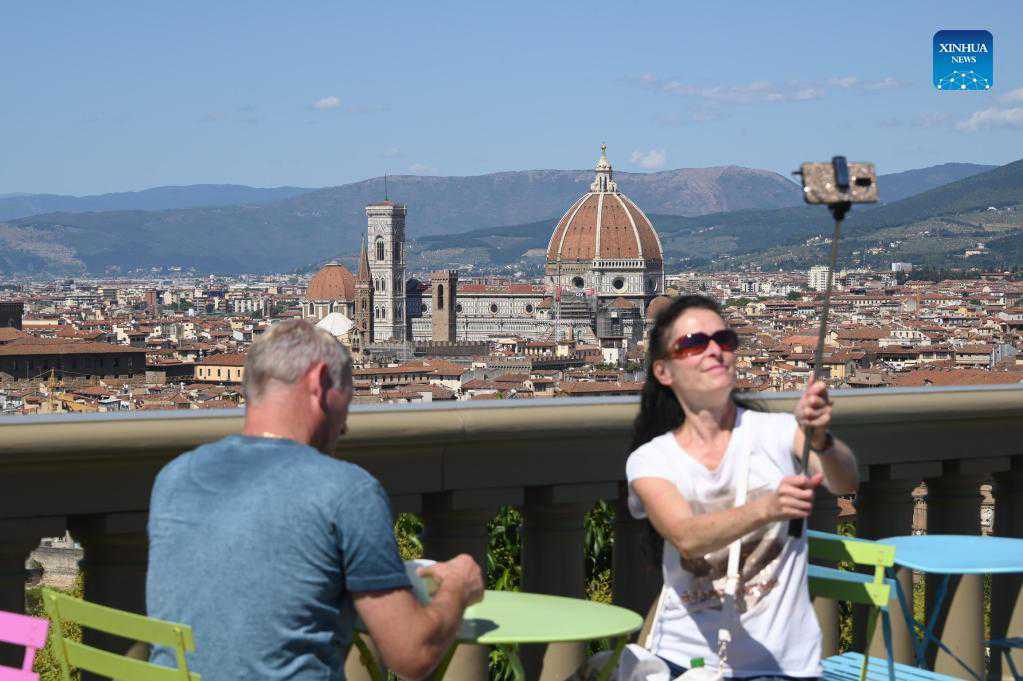 A tourist takes a selfie at Piazzale Michelangelo in Florence, Italy, on Sept. 2, 2021. (Photo by Alberto Lingria/Xinhua)