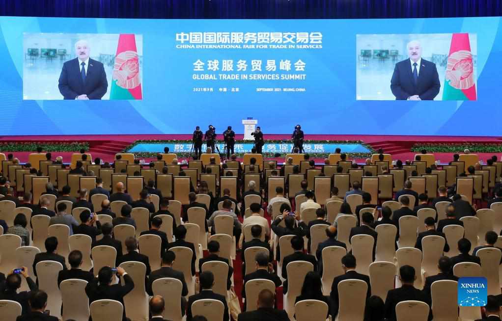 Belarusian President Alexander Lukashenko addresses the Global Trade in Services Summit of the 2021 China International Fair for Trade in Services via video, Sept. 2, 2021. (Xinhua/Huang Jingwen)