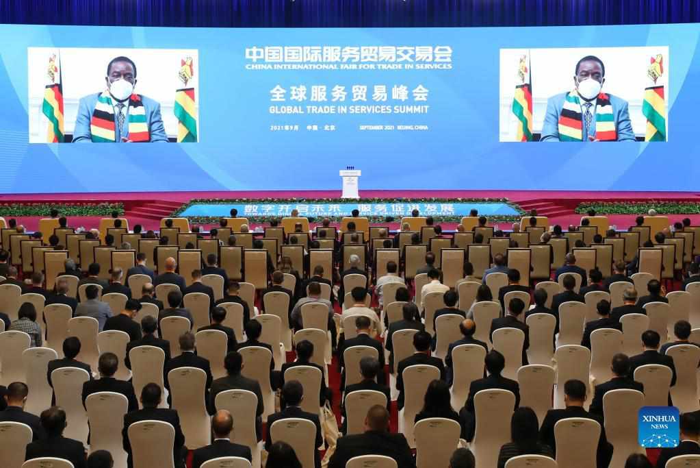 Zimbabwean President Emmerson Mnangagwa addresses the Global Trade in Services Summit of the 2021 China International Fair for Trade in Services via video, Sept. 2, 2021. (Xinhua/Huang Jingwen)