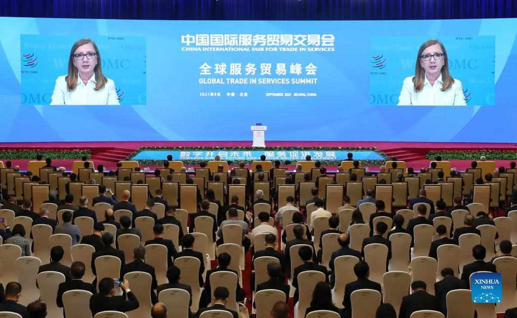 Anabel Gonzalez, deputy director-general of the World Trade Organization, addresses the Global Trade in Services Summit of the 2021 China International Fair for Trade in Services via video, Sept. 2, 2021. (Xinhua/Huang Jingwen)