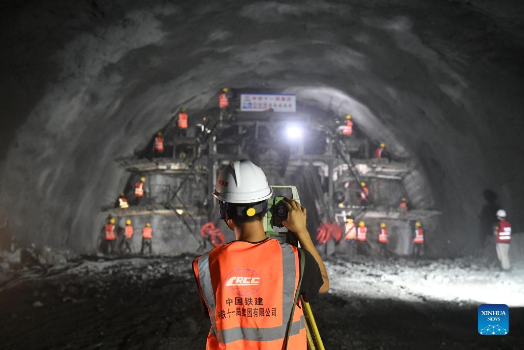 Workers prepare the drill-through of a railway tunnel in Du'an Yao Autonomous County, south China's Guangxi Zhuang Autonomous Region. Sept. 1, 2021. A 15.2-km tunnel on the high-speed railway linking Nanning of south China's Guangxi Zhuang Autonomous Region and Guiyang of southwest China's Guizhou Province was drilled through on Thursday. (Xinhua/Lu Boan)
