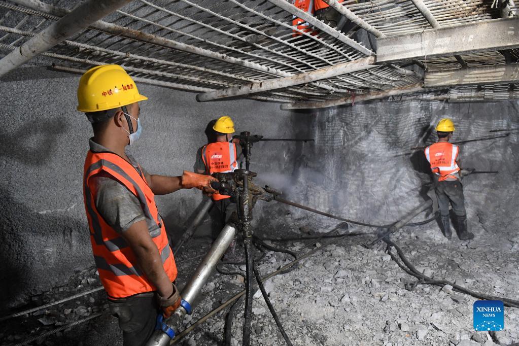 Workers prepare the drill-through of a railway tunnel in Du'an Yao Autonomous County, south China's Guangxi Zhuang Autonomous Region. Sept. 1, 2021. A 15.2-km tunnel on the high-speed railway linking Nanning of south China's Guangxi Zhuang Autonomous Region and Guiyang of southwest China's Guizhou Province was drilled through on Thursday. (Xinhua/Lu Boan)