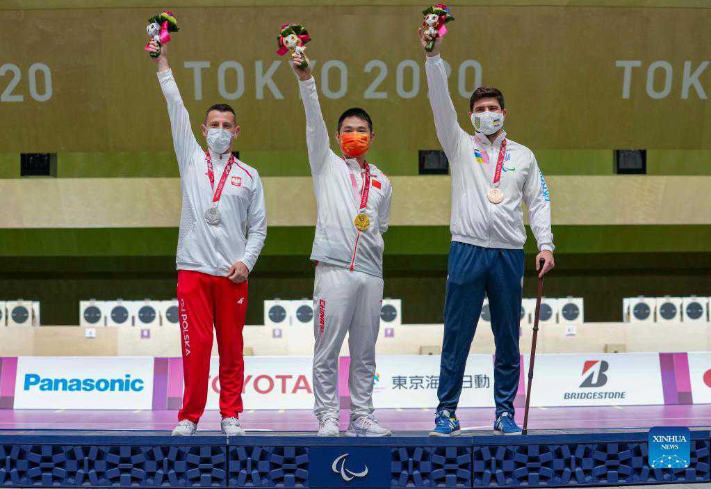 Gold medalist Huang Xing (C) of China, silver medalist Szymon Sowinski (L) of Poland and bronze medalist Oleksii Denysiuk of Ukraine gesture during the awarding ceremony after the mixed 25m pistol SH1 final of shooting event at the Tokyo 2020 Paralympic Games in Tokyo, Japan, Sept. 2, 2021. (Xinhua/Hu Huhu)